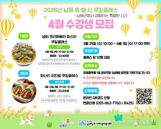 전국신문언론노동조합 강찬희 기자 | 남해군이 봄 제철 식재료를 활용해 군민들에게 특별한 미식 경험을 선사하는 쿠킹클래스를 마련하고 수강생 모집에 나선다.