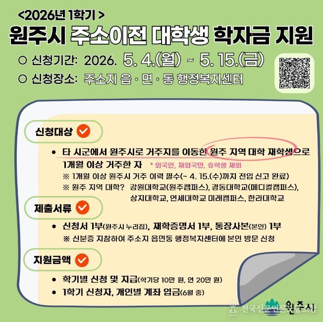 전국신문언론노동조합 강찬희 기자 | 원주시는 전입신고를 마치고 원주시민이 된 대학생에게 상·하반기 각 10만 원씩 연간 20만 원의 학자금을 지원한다.