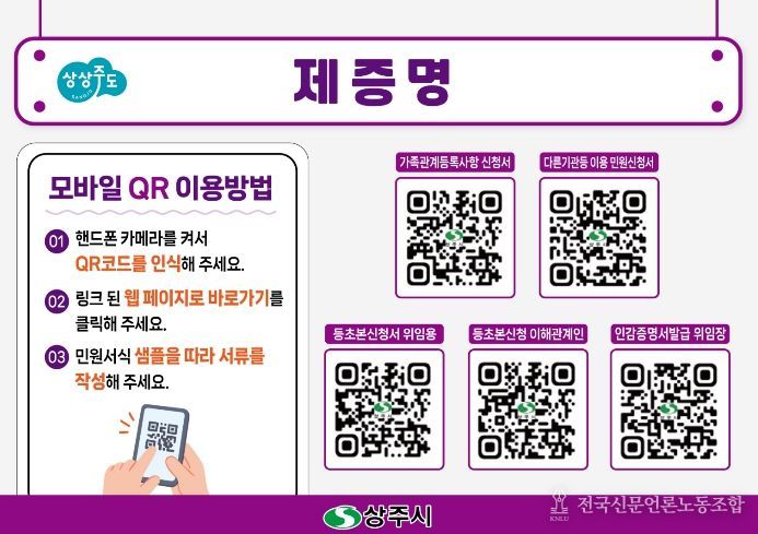 전국신문언론노동조합 강찬희 기자 | 상주시는 민원서식 작성에 어려움을 겪는 시민들의 불편을 해소하고 민원 처리의 편의성을 높이기 위해 QR코드를 활용한 ‘민원서류 작성 예시 안내 서비스’를 도입한다고 밝혔다.