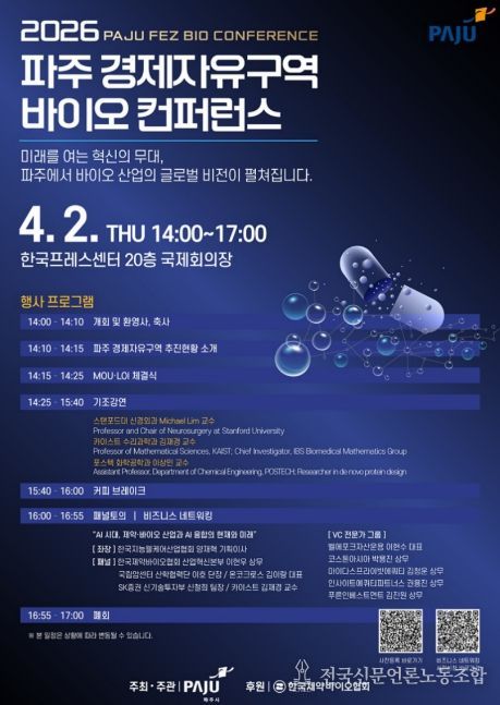 전국신문언론노동조합 김성길 기자 | 파주시는 오는 4월 2일 14시, 서울 중구 한국프레스센터 국제회의장에서 녪파주 경제자유구역 바이오 컨퍼런스’를 개최한다.