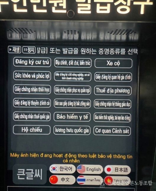 전국신문언론노동조합 강찬희 기자 | 서울 중구는 한국어가 서툰 다문화 가족과 귀화 주민을 위해 무인민원발급기에 ‘외국어 지원 서비스’를 도입하고 시범 운영에 들어갔다. 시범 운영 장소는 외국인 방문이 잦은 중구청사와 다문화 거주 비율이 높은 광희동 주민센터 두 곳이다.
