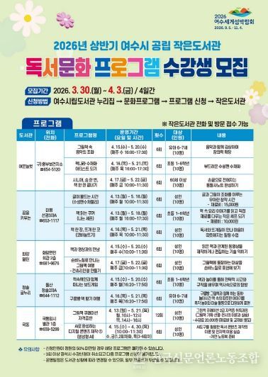 전국신문언론노동조합 강찬희 기자 | 여수시는 오는 3월 30일부터 4월 3일까지 공립 작은도서관 ‘2026년 상반기 독서문화 프로그램’ 수강생을 모집한다고 밝혔다.