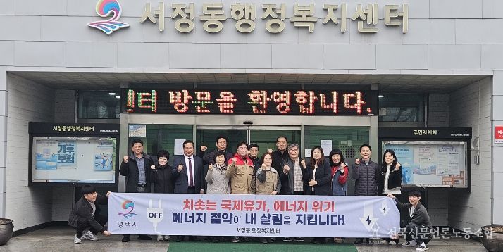 전국신문언론노동조합 김성길 기자 | 평택시 서정동 행정복지센터는 지난 24일 서정동 9개단체협의회, 서정동 바르게살기위원회 회원, 행정복지센터 직원 등 약 20명이 참여해 최근 중동 지역 긴장 고조에 따른 에너지 수급 불안에 대비하여 에너지 절약 분위기 확산을 위한 에너지 절약 캠페인을 실시했다.