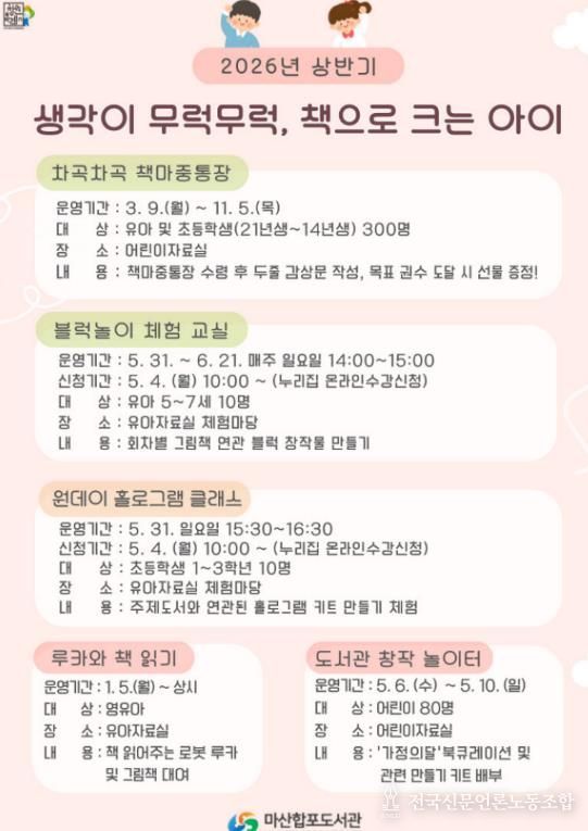 전국신문언론노동조합 강찬희 기자 | 창원특례시 마산합포도서관은 어린이를 대상으로 체험과 놀이를 기반으로 한 독서프로그램 ‘생각이 무럭무럭, 책으로 크는 아이’를 3월부터 11월까지 운영한다.