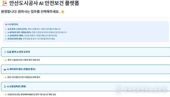 전국신문언론노동조합 김성길 기자 | 안산도시공사는 생성형 인공지능(AI) 기술을 접목한 ‘AI 안전보건 플랫폼’을 자체 개발해 현장 사고 예방 업무에 본격적으로 활용한다고 25일 밝혔다.