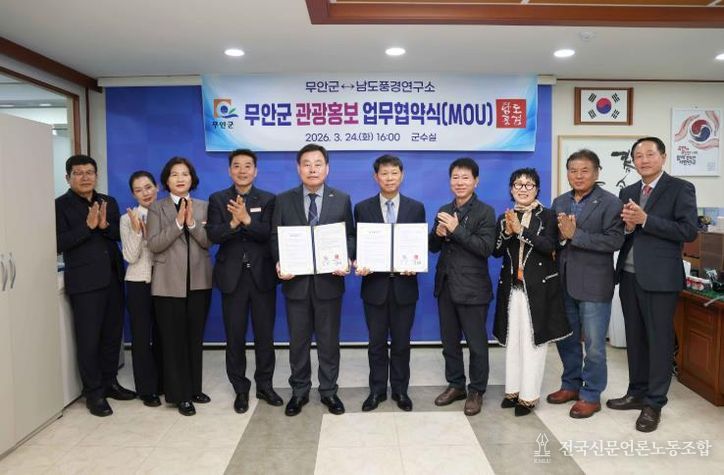 전국신문언론노동조합 강찬희 기자 | 무안군은 지난 24일 군수실에서 남도지역 풍경정보를 전국에 제공·기록하는 단체인 남도풍경연구소와 자연·문화·관광자원 홍보를 위한 업무협약(MOU)을 체결했다.