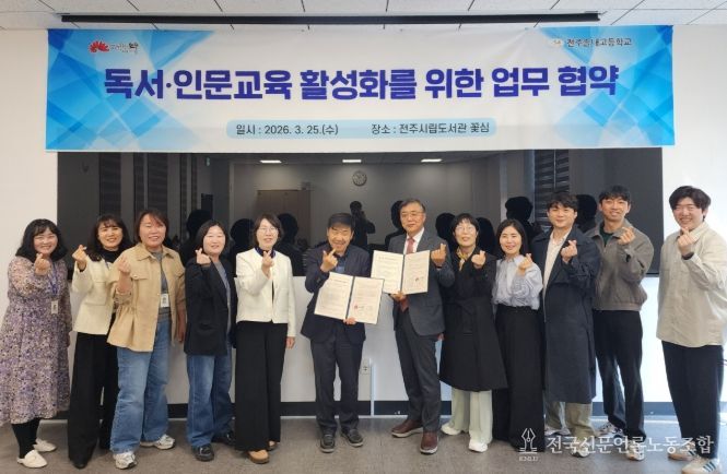 전국신문언론노동조합 강찬희 기자 | 전주시 도서관평생학습본부는 25일 전주시립도서관 꽃심 강당에서 전주솔내고등학교와 ‘독서·인문교육 활성화를 위한 업무협약’을 체결했다.