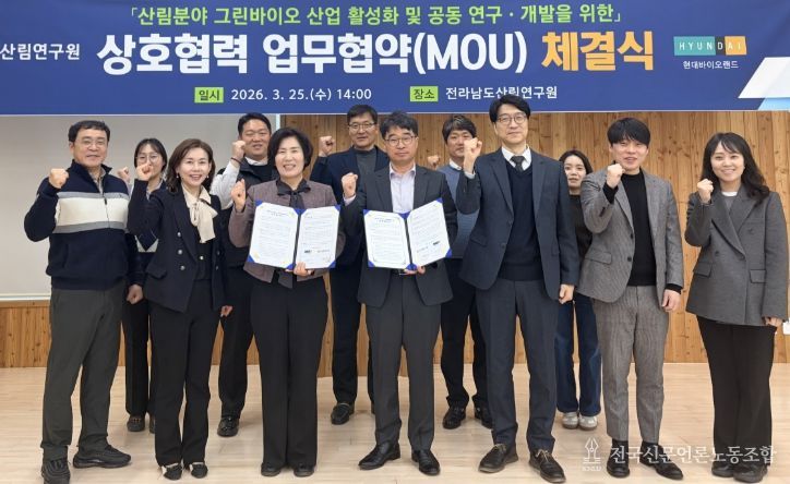 전국신문언론노동조합 강찬희 기자 | 전라남도산림연구원이 25일 ㈜현대바이오랜드와 산림자원을 활용한 그린바이오 산업 활성화를 위해 업무협약을 하고, 고부가가치 제품 개발과 원물의 안정적 생산체계 구축을 위한 상호 협력에 나섰다.