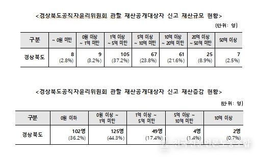 전국신문언론노동조합 강찬희 기자 | 경상북도공직자윤리위원회(위원장 이순동)는 소관 재산공개 대상자 282명*의 정기 재산변동사항 신고내역을 경상북도 도보 및 공직자윤리시스템을 통해 이번 달 26일자로 공개했다.