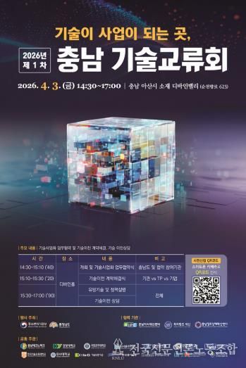 전국신문언론노동조합 강찬희 기자 | (재)충남테크노파크는 오는 4월 3일 충남 아산시 디바인밸리에서 산·학·연 협력 기반의 기술사업화 촉진을 위한 ‘2026년 제1차 충남 기술교류회’를 개최한다고 밝혔다.