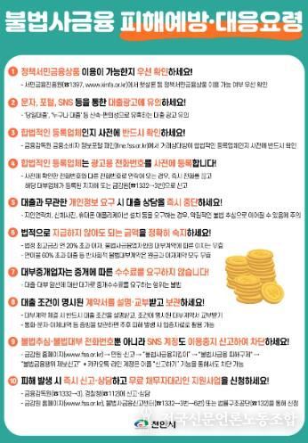 전국신문언론노동조합 강찬희 기자 | 천안시가 민생 경제를 위협하는 불법사금융으로부터 시민을 보호하기 위해 제도적 대응과 홍보에 나섰다.