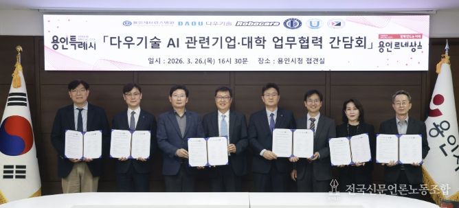 전국신문언론노동조합 김성길 기자 | 용인특례시는 26일 ㈜다우기술, 지역내 대학, 병원, 인공지능산업 관련 기업 관계자들과 ‘지역 AI 및 벤처기업 육성을 위한 사무공간 무상제공 수요처 간담회’를 개최했다.