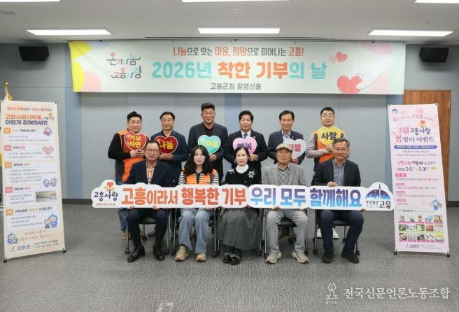 전국신문언론노동조합 강찬희 기자 | 고흥군은 지난 26일 군청 팔영산홀에서 3월 ‘착한 기부의 날’ 행사를 개최했다. 이번 행사에는 3개 분야, 6개 팀 10명이 참여해 총 2,200만 원의 소중한 기부금이 모였다.