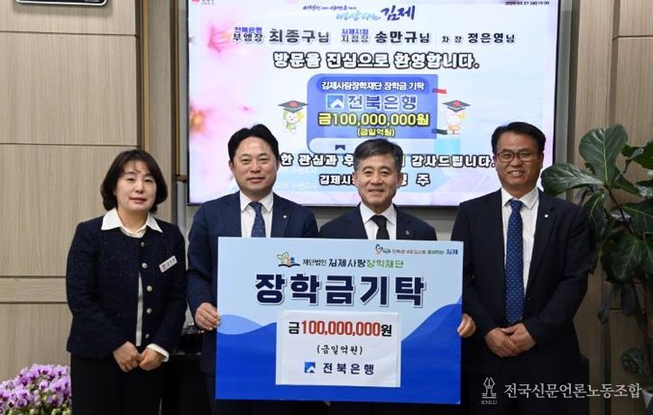 전국신문언론노동조합 강찬희 기자 | 김제사랑장학재단은 27일 전북은행이 지역 인재들이 안정적으로 학업과 미래를 준비할 수 있도록 장학금 1억원을 기탁했다고 밝혔다.