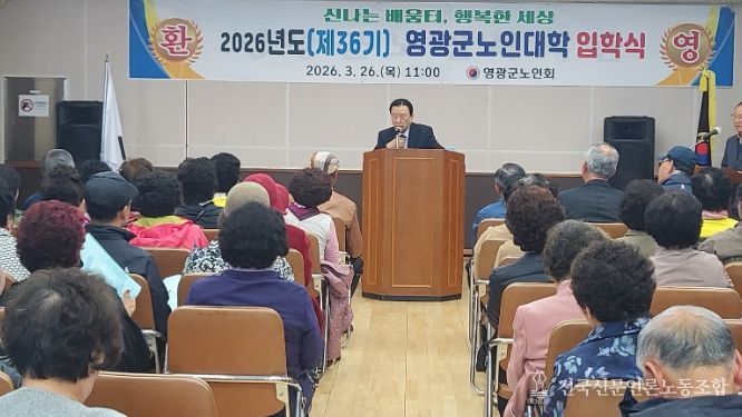 전국신문언론노동조합 강찬희 기자 | (사)대한노인회 영광군지회(회장 김학실)는 3월26일 영광군노인복지관 2층 대강당에서 2026년도 노인대학 입학식을 개최했다.