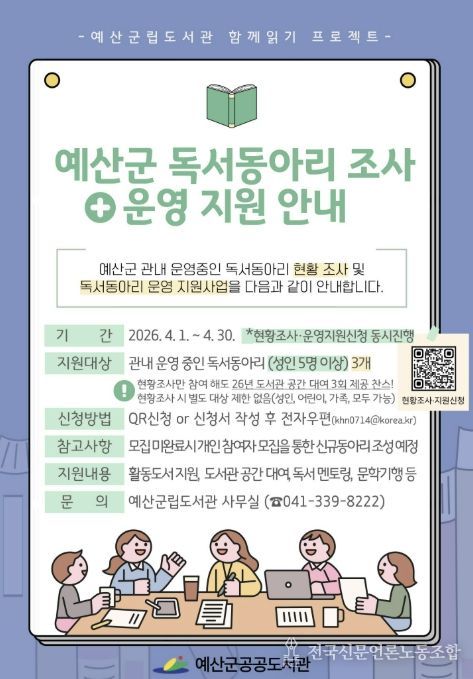 전국신문언론노동조합 강찬희 기자 | 예산군 공공도서관은 지역 내 독서동아리 활동을 체계적으로 지원하고 독서공동체 기반을 넓히기 위해 ‘2026 독서동아리 운영 지원사업’을 추진한다.