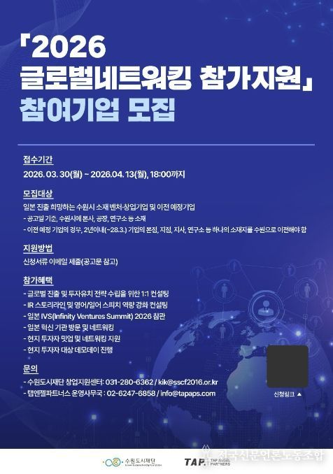 전국신문언론노동조합 김성길 기자 | 수원특례시가 ‘2026 글로벌네트워킹 참가지원’에 참여할 벤처·창업 기업 7개사를 3월 30일부터 4월 13일까지 모집한다.