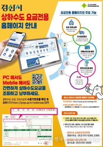 전국신문언론노동조합 강찬희 기자 | 경산시는 시민들의 상하수도 요금 조회 및 납부 편의를 도모하기 위해 상하수도 요금 전용 홈페이지를 개설하고 4월 1일부터 본격 운영한다고 밝혔다.