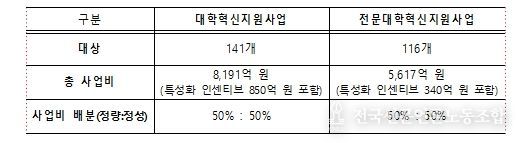 2026년 대학·전문대학 혁신지원사업의 지원 대상은 일반대학(사립대·국립대법인·공립대) 141개, 전문대학(공·사립 전문대) 116개이다.