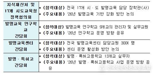 제2부 발명교육 소통의 장에서는 지식재산처-17개 시도교육청 정책협의회를 비롯하여 발명교육 연구학교, 발명교육센터, 발명·특허 고교 간담회를 각각 개최하여 현장 의견을 청취할 예정이다.