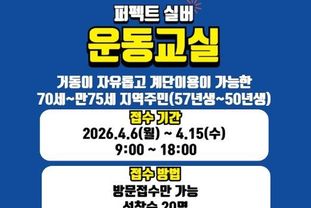 모집 대상은 자발적 거동이 가능하고, 계단 이동이 자유로운 70∼75세(1950∼1957년생) 지역 주민 선착순 20명 내외다. 4월 6일부터 15일까지 센터를 방문해 신청할 수 있다. 자세한 사항은 남원주건강생활지원센터로 문의하거나 센터 밴드를 확인하면 된다.
