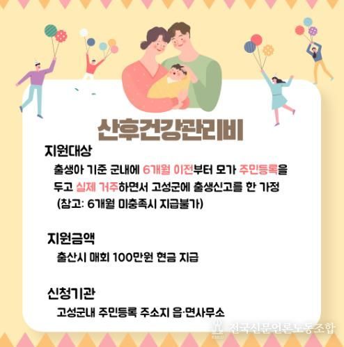 전국신문언론노동조합 강찬희 기자 | 고성군은 출산 가정의 경제적 부담을 덜고 산모의 건강한 회복을 돕기위해 ‘산후건강관리비 지원사업’을 적극 추진하여 출산 친화적 분위기 조성에 앞장서고 있다.