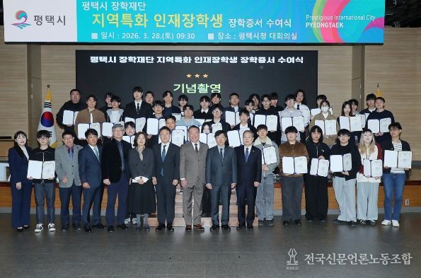 전국신문언론노동조합 김성길 기자 | 평택시 장학재단은 지난 3월 28일 평택시청 대회의실에서 '2026년도 지역특화 인재 장학생 장학증서 수여식'을 개최했다.