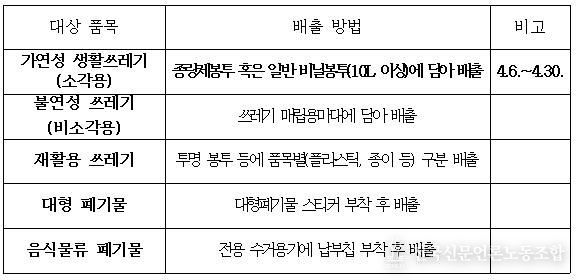 이에 시는 4월 30일까지 한시적으로 ‘가연성(소각 가능한) 일반 생활쓰레기’에 한해 10L 이상 일반 비닐봉투에 담아 배출할 경우 정상 수거할 계획이다.