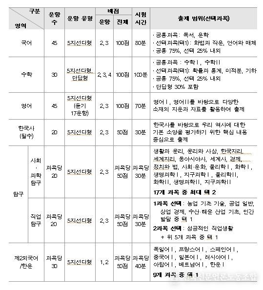 2. 국어, 수학 영역은 ‘공통과목+선택과목’ 구조에 따라 공통과목은 공통 응시하고, 영역별 선택과목 중 1개 과목을 선택함.