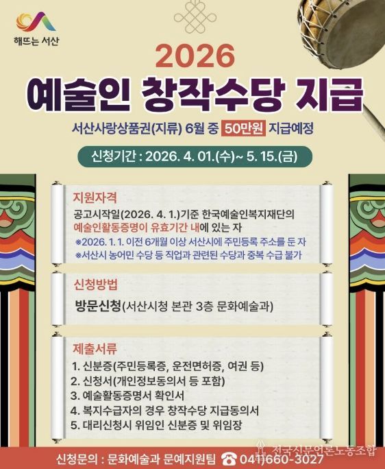 지원 대상은 2026년 1월 1일 이전부터 서산시에 6개월 이상 주민등록을 두고 거주한 전문 예술인으로, 한국예술인복지재단이 발급한 예술활동증명 확인서가 유효해야 한다.