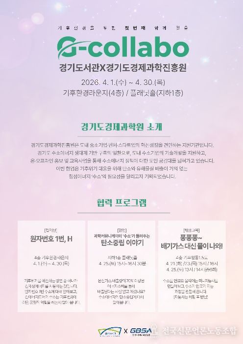 전국신문언론노동조합 김성길 기자 | 경기도서관은 수소 에너지를 널리 알리기 위해 4월 한 달간 경기도경제과학진흥원과 협업프로젝트를 운영한다고 1일 밝혔다. 전시와 강좌, 체험을 연계한 프로그램을 통해 수소산업과 탄소중립에 대한 인식을 확산하는 것이 목적이다.