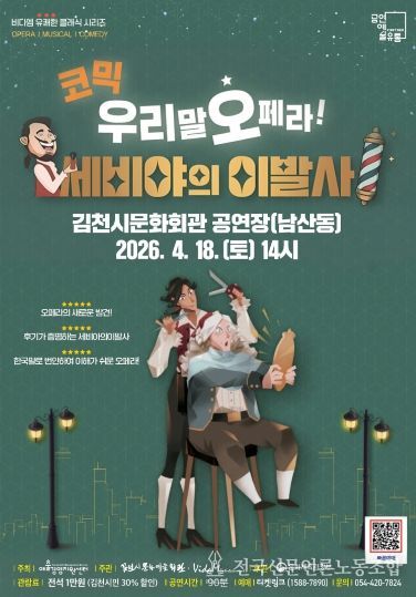 전국신문언론노동조합 강찬희 기자 | 김천시 문화예술회관은 온 가족이 함께 웃으며 즐길 수 있는 우리말 코믹 오페라 '세비야의 이발사'를 오는 4월 18일, 김천시문화회관(남산동)에서 개최한다.