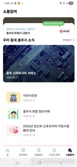 전국신문언론노동조합 김성길 기자 | 충주시는 시민들이 일상에서 보다 편리하게 도시 정보를 이용할 수 있도록 ‘충주사랑상품권’ 앱 내 소통참여 서비스를 통해 스마트시티 통합플랫폼 모바일 홈페이지를 연계했다고 2일 밝혔다.