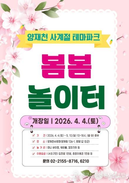 전국신문언론노동조합 강찬희 기자 | 서울 서초구(는 지난 겨울 큰 사랑을 받았던 양재천 눈썰매장을 4월 4일(토)부터 어린이 테마파크인 ‘봄봄놀이터’로 운영한다고 밝혔다.