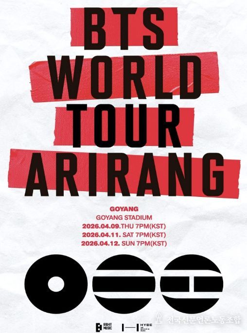 오는 4월 9일, 11일, 12일 3일간 고양종합운동장에서 ⌜BTS 월드투어 ‘아리랑’ 인 고양⌟이 개최된다. 광화문광장에서 열린 컴백쇼로 완전체 귀환을 알린 BTS가 본격적인 월드투어 대장정의 첫 무대를 고양시에서 선보인다. 공연은 3회차 전석 매진을 기록했으며 사흘간 약 12만 명 관람객이 방문할 것으로 예상된다.