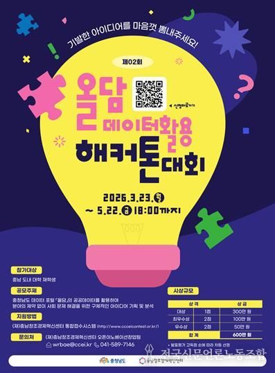전국신문언론노동조합 강찬희 기자 | 충남창조경제혁신센터는 충남도내 대학 재학생을 대상으로 공공데이터를 활용한 창의적 아이디어 발굴을 위한 '제2회 올담 데이터 활용 해커톤' 참가자를 오는 5월 22일까지 모집한다고 밝혔다.