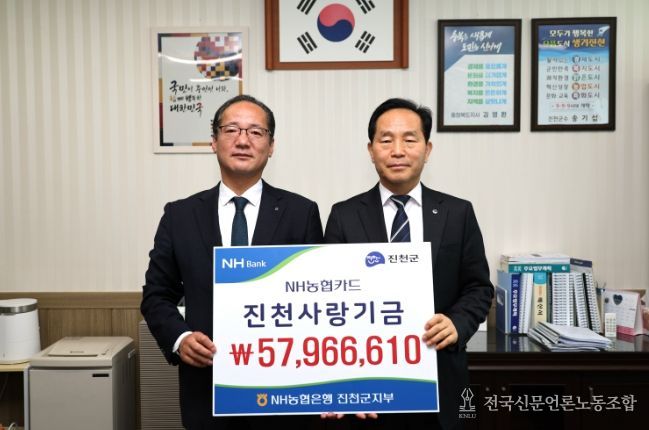전국신문언론노동조합 김성길 기자 | NH농협은행 진천군지부는 2일 진천군청을 방문해 2025년도 제휴카드 사용에 따른 적립 기금 5천796만 원을 진천군에 전달했다.