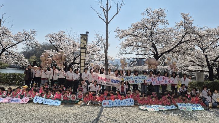 이번 캠페인에는 김천시립어린이집 6개소(모암, 개령, 센트럴자이, 율곡, 지례, 아포)의 원생 및 보육교사 120여 명이 참여해 벚꽃 명소인 연화지 산책로를 따라 이동하며 시민들을 대상으로 출산과 육아의 소중함을 전달했다.