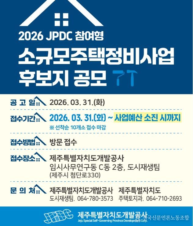 전국신문언론노동조합 강찬희 기자 | 제주특별자치도와 제주특별자치도개발공사(사장 백경훈)는 대규모 정비사업 추진이 어려운 노후 주거지의 환경을 개선하고, 양질의 주택공급을 확대하기 위해 작년에 이어 올해에도 ‘JPDC참여형 소규모주택정비사업 신규 후보지 발굴 공모’를 실시한다고 밝혔다.