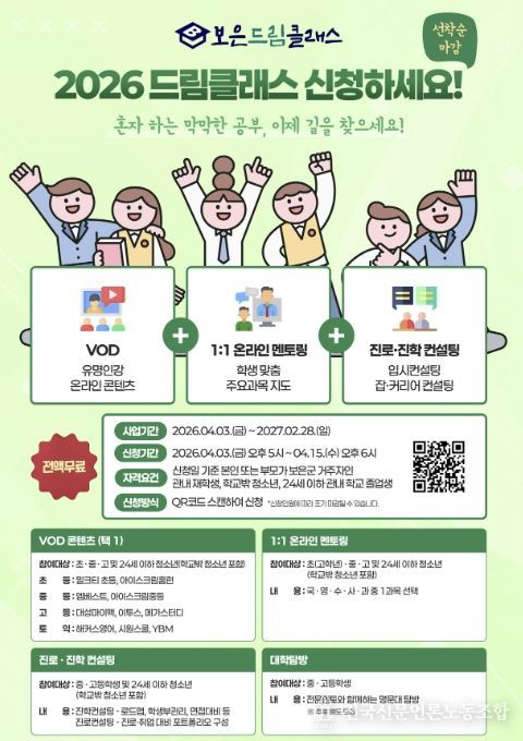 최재형 보은군수는 “보은 드림 클래스는 교육 기반이 상대적으로 부족한 지역 여건을 보완하고 학생들에게 균등한 교육 기회를 제공하기 위한 사업”이라며 “앞으로도 관내 학교 및 지역사회와 협력해 실효성 있는 교육 지원을 지속적으로 확대해 나가겠다”고 말했다.