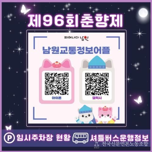 축제 관련 현수막과 주차장·셔틀버스 안내 홍보물 등에 QR코드를 삽입해, 별도의 검색 과정 없이 스마트폰 스캔만으로 남원시 교통정보 앱을 즉시 설치할 수 있도록 지원할 계획이다.