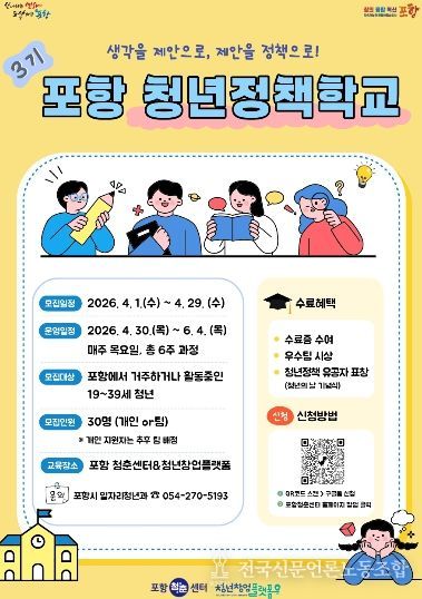 전국신문언론노동조합 강찬희 기자 | 포항시가 오는 4월 29일까지 ‘2026년 포항 청년정책학교’ 참여자를 모집한다.