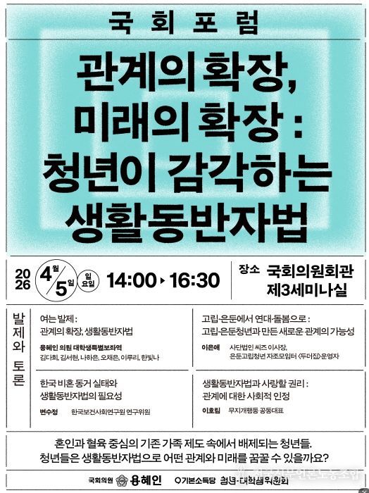 기본소득당 용혜인 의원과 기본소득당 청년 대학생위원회는 4월 5일 오후 2시 국회의원회관 제3세미나실에서 '관계의 확장, 미래의 확장 : 청년이 감각하는 생활동반자법' 국회포럼을 개최한다.