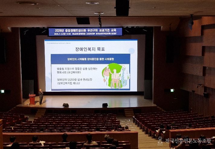 전국신문언론노동조합 강찬희 기자 | 충남도는 3일 도청 문예회관에서 중증장애인 생산품 우선구매 관련 공공기관의 인식 제고 및 구매 독려를 위한 ‘2026년 공공기관 중증장애인생산품 우선구매 교육’을 실시했다.