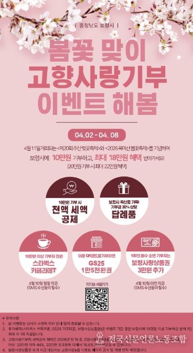 전국신문언론노동조합 강찬희 기자 | 보령시가 제20회 주산 벚꽃축제와 2026 옥마산 봄꽃축제를 맞아 오는 4월 8일까지 ‘봄꽃 맞이 고향사랑기부 이벤트 해봄’을 진행한다.