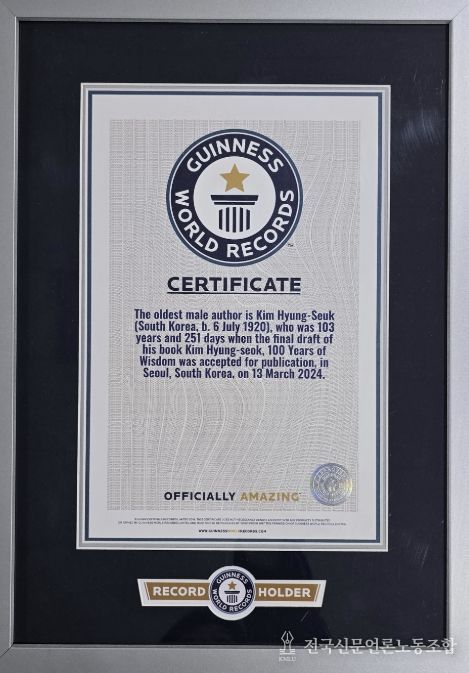 기네스북에 등재된 김 교수의 공식 기록 연령은 저서 『김형석, 백년의 지혜』를 출간했을 당시인 ‘103세 251일’이다. 이로써 김 교수는 전 세계에서 가장 고령의 나이에 저서를 집필하고 출간한 저자로 이름을 올리게 됐다.