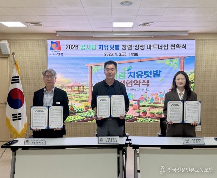 전국신문언론노동조합 김성길 기자 | 안성시 농업기술센터는 지난 4월 3일 센터 내 생활과학관에서 비룡중학교 및 대표 치유농업사와 함께 '2026 꿈자람 치유텃밭 청렴·상생 파트너십 협약'을 체결했다.