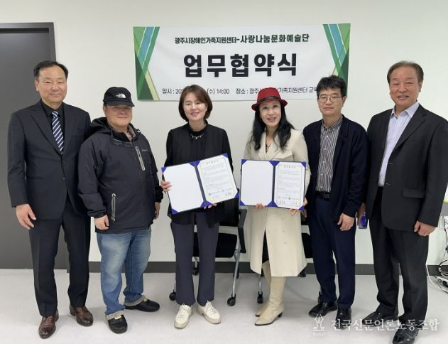 전국신문언론노동조합 김성길 기자 | 광주시장애인가족지원센터는 지난 1일 비영리민간단체 사랑나눔문화예술단과 장애인 가족의 문화예술 향유 기회 확대와 삶의 질 향상을 위한 업무협약을 체결했다.