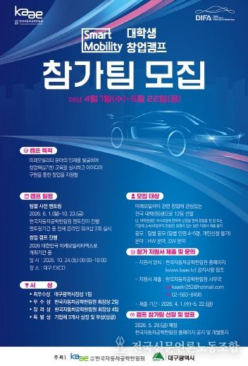 전국신문언론노동조합 강찬희 기자 | 대구광역시는 자동차 산업 원로들의 풍부한 현장 경험과 청년들의 혁신적인 아이디어를 결합해 미래모빌리티 핵심 인재를 육성하는 ‘2026 스마트 모빌리티 창업캠프’ 참가팀을 모집한다.