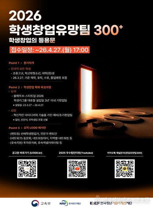전국신문언론노동조합 강찬희 기자 | 교육부와 한국청년기업가정신재단(이사장 한정화)은 '2026 학생 창업유망팀 300+' 참가팀을 4월 8일부터 4월 27일까지 모집한다.